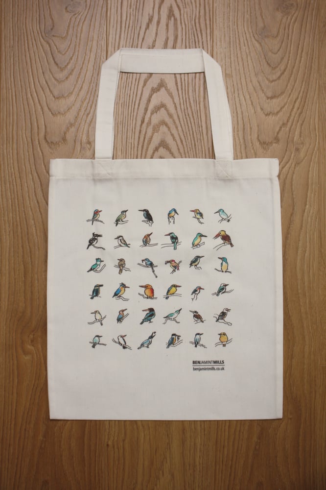 Cotton canvas tote bag, decorated with a vivid full colour hot press print depicting 36 of the world's fanciest and coolest kingfisher species.